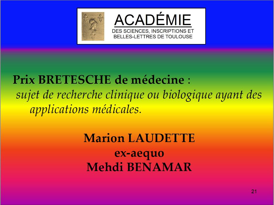 Prix Bretesche de médecine : sujet de recherche clinique ou biologique ayant des applications médicales. Lauréats ex aequo : Marion Laudette et Mehdi Benamar.