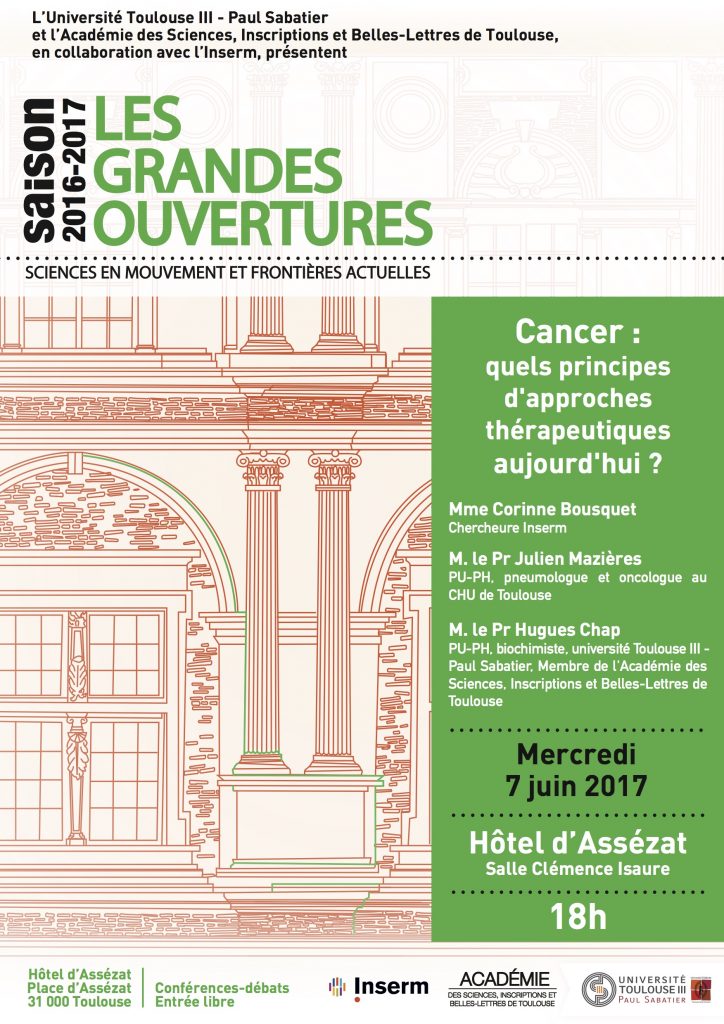 Accueil»Activités » Grandes Ouvertures – 7 Juin 2017 – « Cancer : quels principes d’approches thérapeutiques aujourd’hui ? » (C. BOUSQUET, J. MAZIÈRES, H. CHAP)