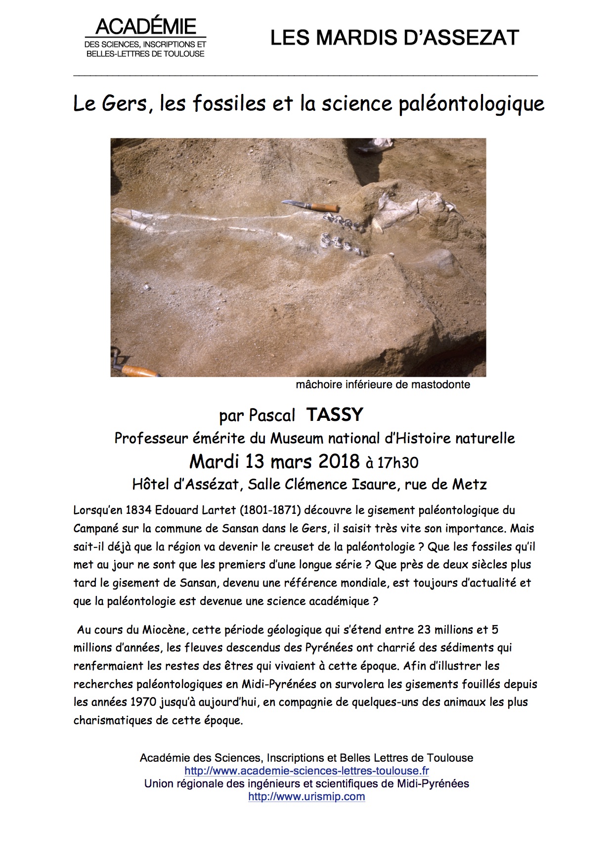 Mardi Assézat – 13 Mars 2018 : « Le Gers, les fossiles et la science paléontologique. » (P. TASSY)