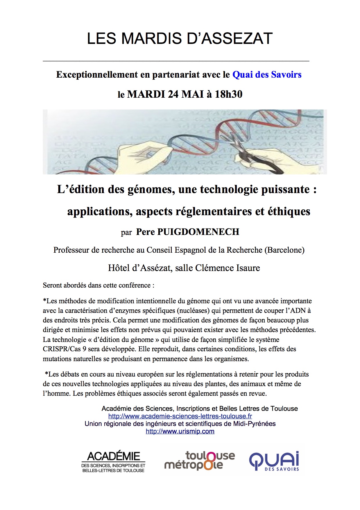 Prochain Mardi d’Assézat : 24 Mai 18h30 – L’édition du Génôme (Pere PUIGDOMENECH)